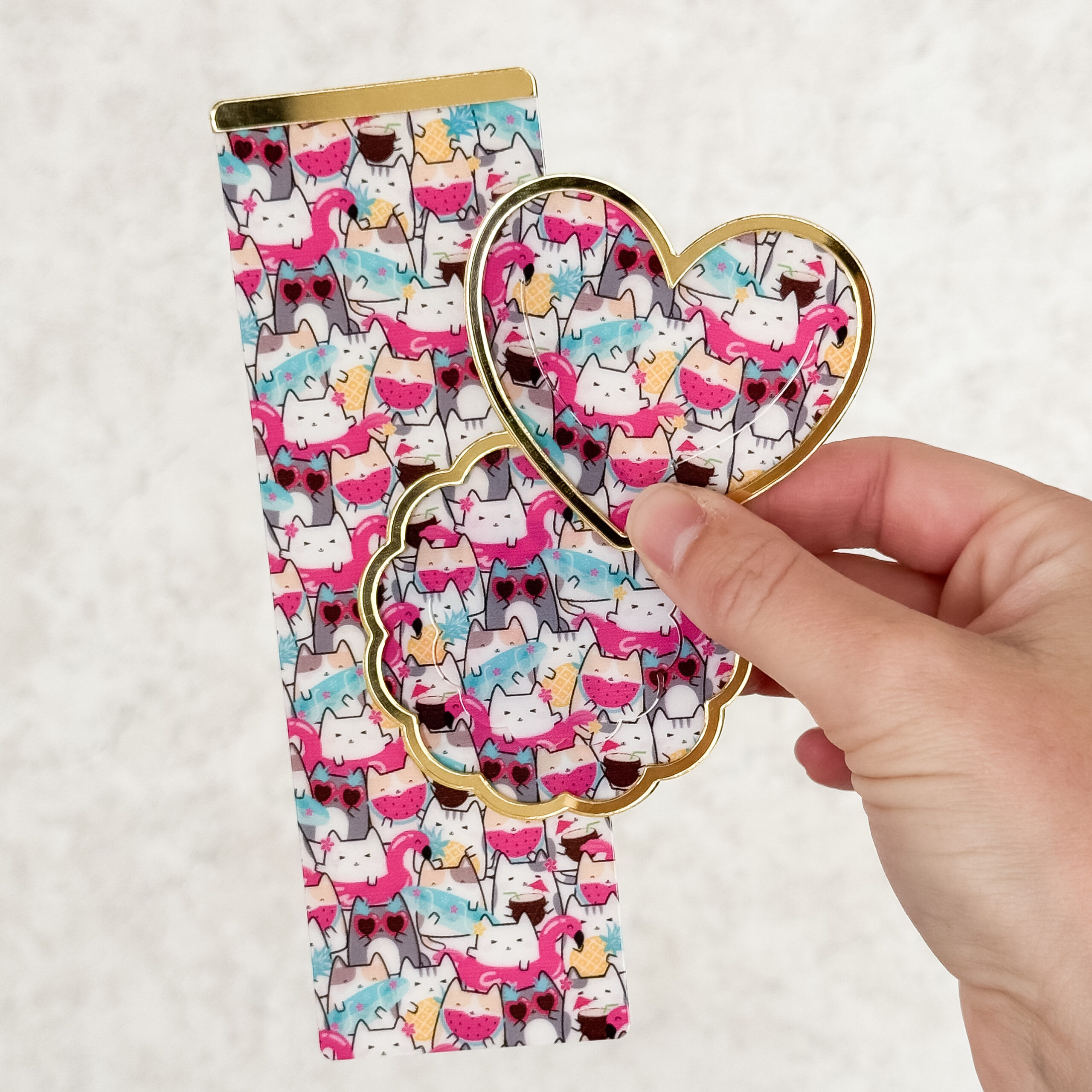 Elevate your reading experience with this mirrored gold acrylic bookmark set. Includes one full-length bookmark with a gold mirrored acrylic lip at the top to prevent slipping between the pages when the book is closed and two corner bookmarks that hug page edges, peeking out of the book when closed for easy reference. Durable, lightweight, and eye-catching—perfect for marking pages and adding personality to your favorite books.