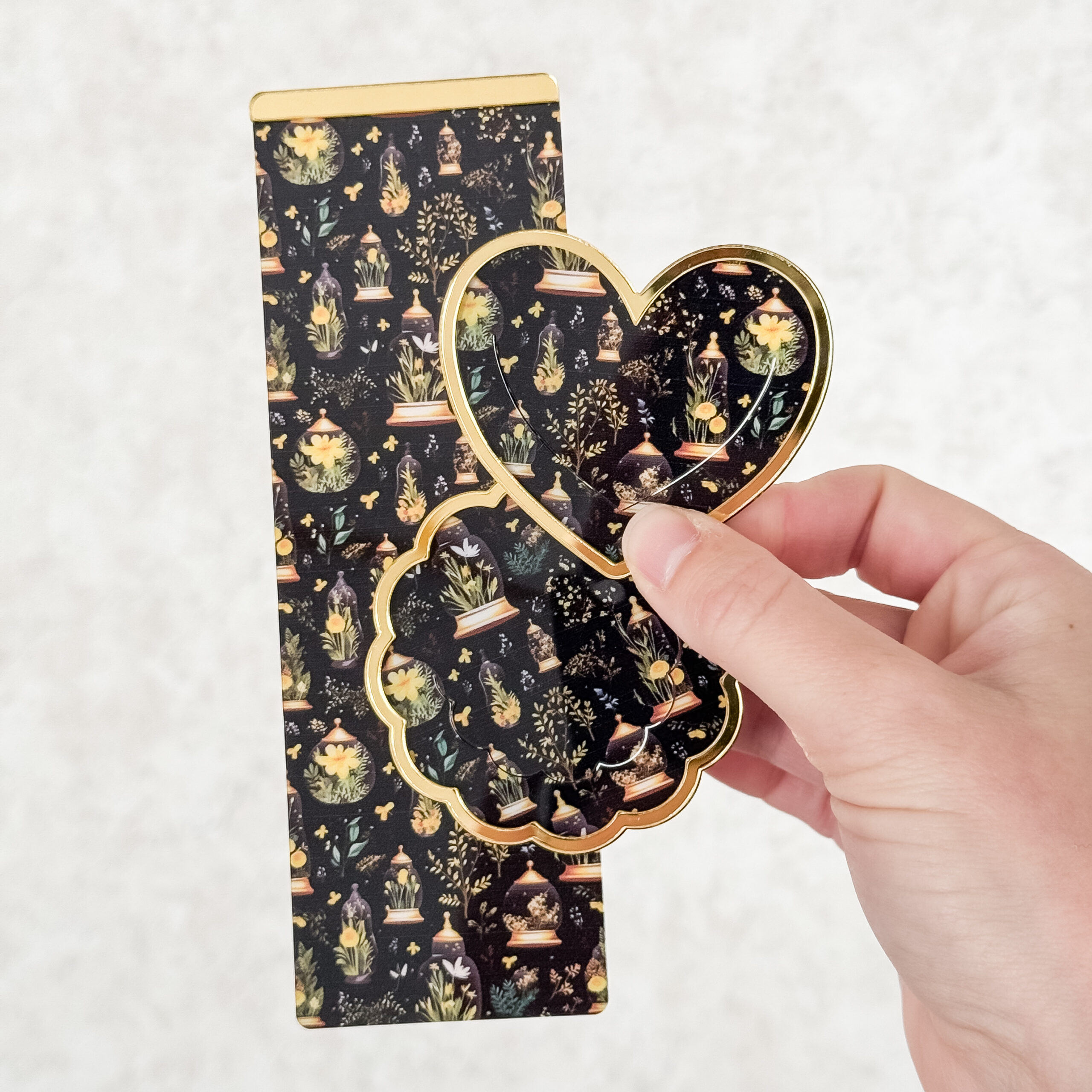 Elevate your reading experience with this mirrored gold acrylic bookmark set. Includes one full-length bookmark with a gold mirrored acrylic lip at the top to prevent slipping between the pages when the book is closed and two corner bookmarks that hug page edges, peeking out of the book when closed for easy reference. Durable, lightweight, and eye-catching—perfect for marking pages and adding personality to your favorite books.