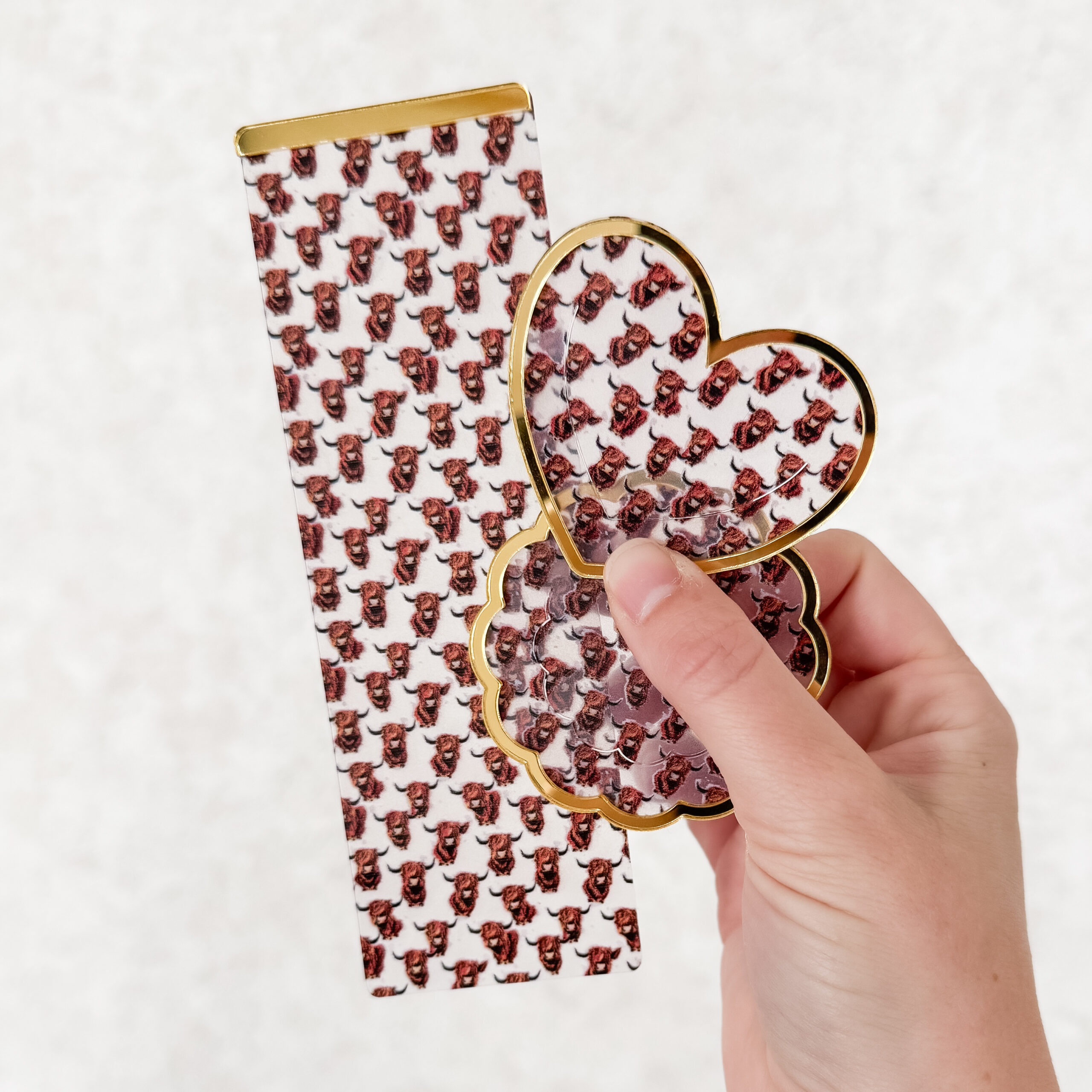Elevate your reading experience with this mirrored gold acrylic bookmark set. Includes one full-length bookmark with a gold mirrored acrylic lip at the top to prevent slipping between the pages when the book is closed and two corner bookmarks that hug page edges, peeking out of the book when closed for easy reference. Durable, lightweight, and eye-catching—perfect for marking pages and adding personality to your favorite books.