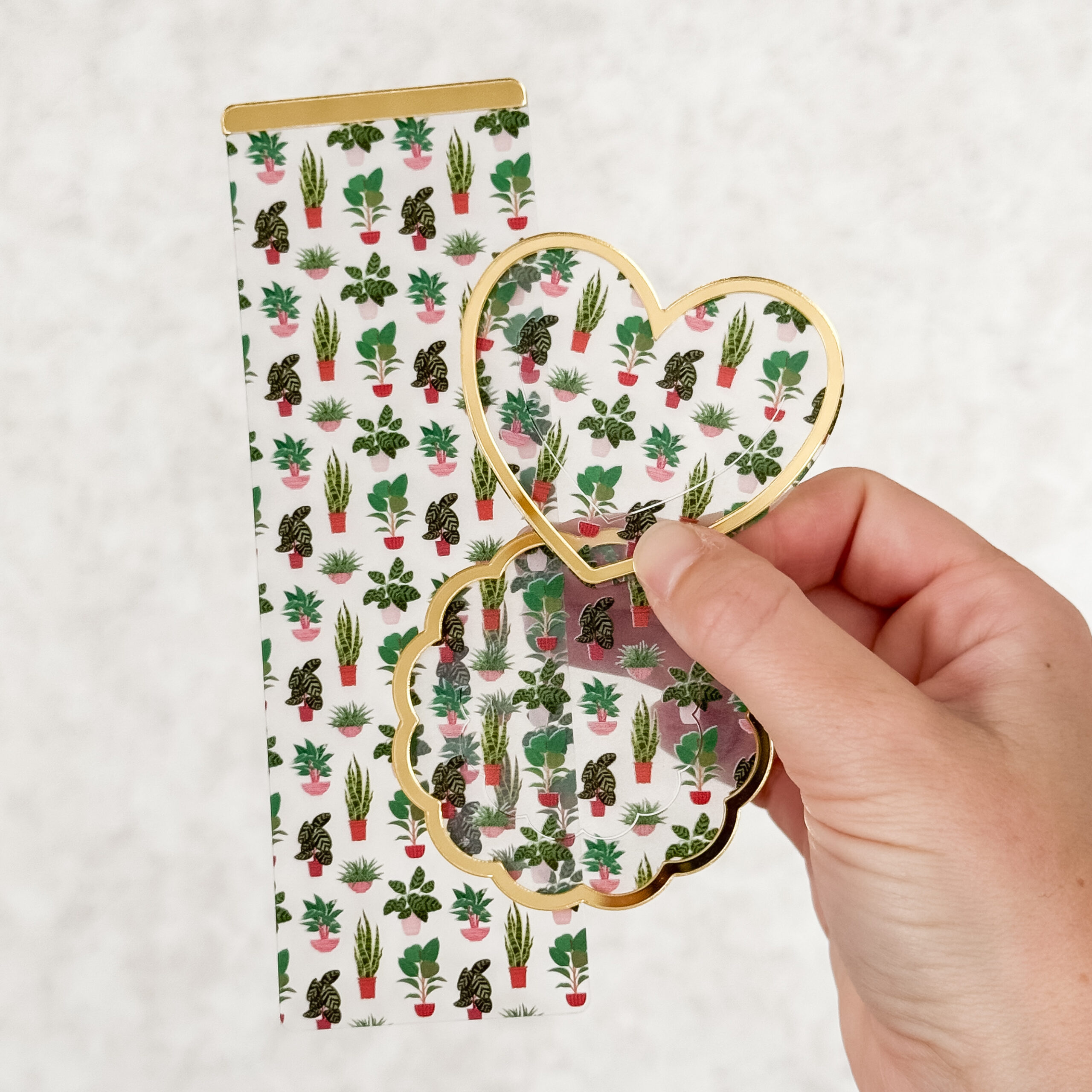 Elevate your reading experience with this mirrored gold acrylic bookmark set. Includes one full-length bookmark with a gold mirrored acrylic lip at the top to prevent slipping between the pages when the book is closed and two corner bookmarks that hug page edges, peeking out of the book when closed for easy reference. Durable, lightweight, and eye-catching—perfect for marking pages and adding personality to your favorite books.