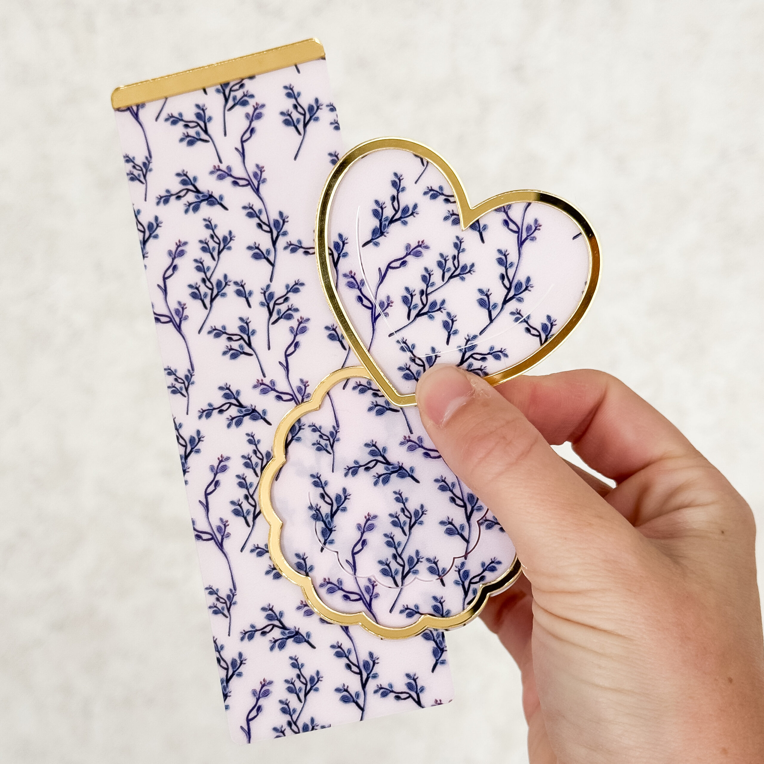 Elevate your reading experience with this mirrored gold acrylic bookmark set. Includes one full-length bookmark with a gold mirrored acrylic lip at the top to prevent slipping between the pages when the book is closed and two corner bookmarks that hug page edges, peeking out of the book when closed for easy reference. Durable, lightweight, and eye-catching—perfect for marking pages and adding personality to your favorite books.