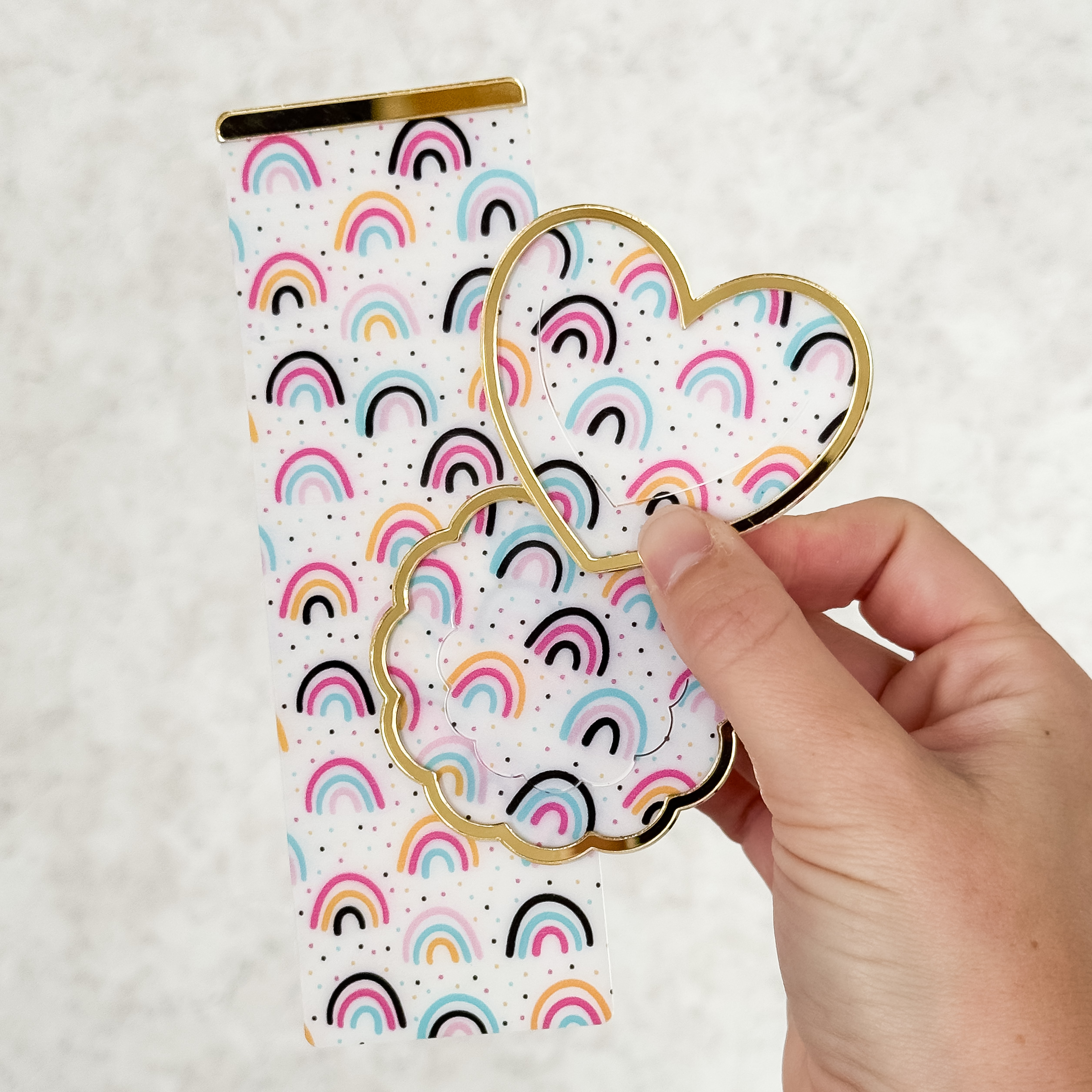 Elevate your reading experience with this mirrored gold acrylic bookmark set. Includes one full-length bookmark with a gold mirrored acrylic lip at the top to prevent slipping between the pages when the book is closed and two corner bookmarks that hug page edges, peeking out of the book when closed for easy reference. Durable, lightweight, and eye-catching—perfect for marking pages and adding personality to your favorite books.