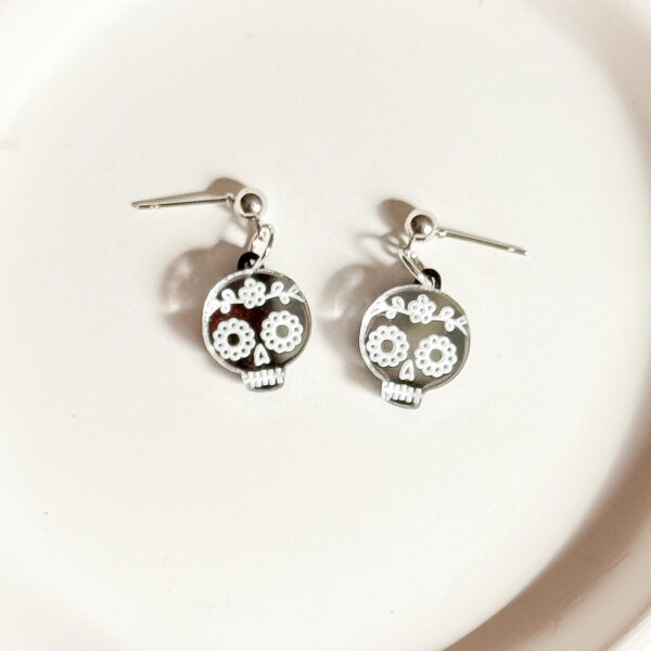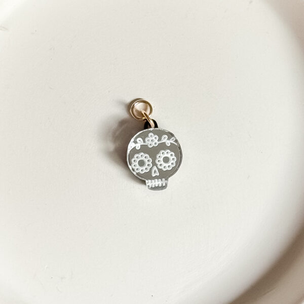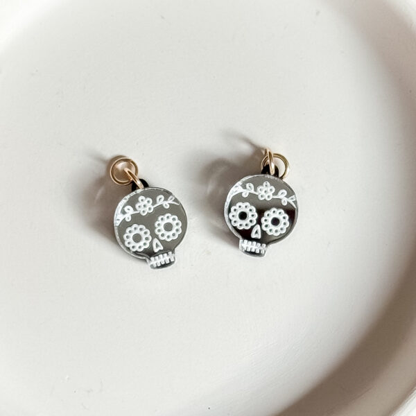 These mirrored sugar skulls are a cute spooky accessory to interchange with your fall outfits.