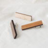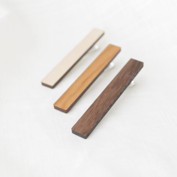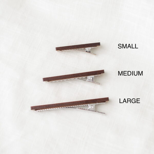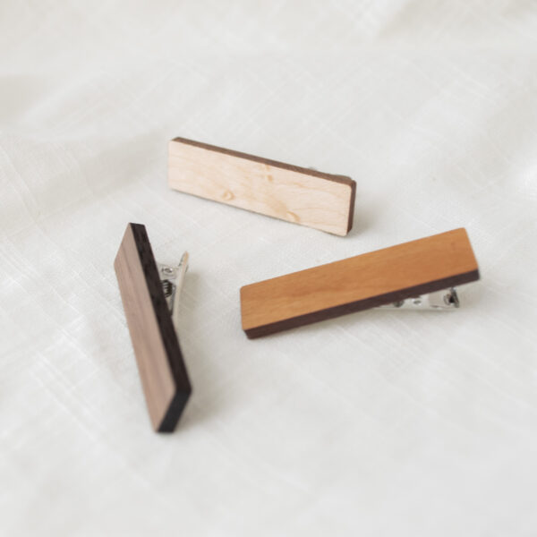 A set of three wooden gator clip style barrettes that hold any thickness of hair and compliment any outfit. You will receive one of each wood type – maple, cherry, walnut – to make a complete set of three.